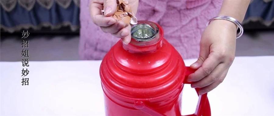 1. 準備2個雞蛋殼,用手捏碎后放入熱水瓶中;